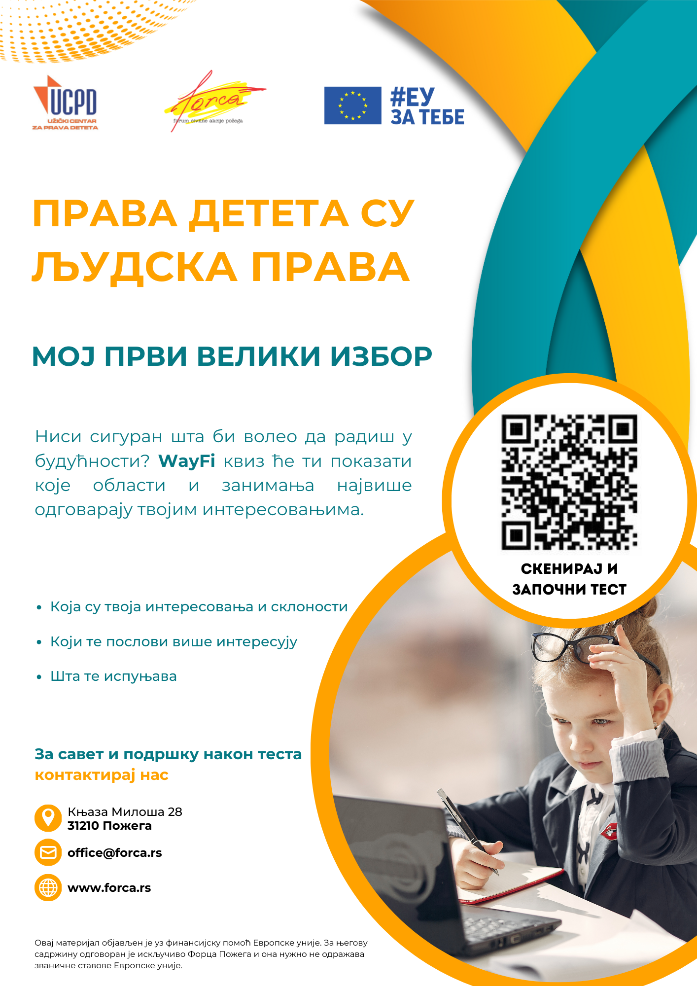 Početkom nove školske godine Udruženje građana FORCA kreće u promociju inovativnog alata namenjenog mladima – online kviza Way Fi. U saradnji sa karijernim timovima u školama, cilj je da učenici već u ranim fazama školovanja počnu da otkrivaju svoja interesovanja i sposobnosti i tako planiraju dalji put obrazovanja, studiranja ili početka profesionalnih karijera.